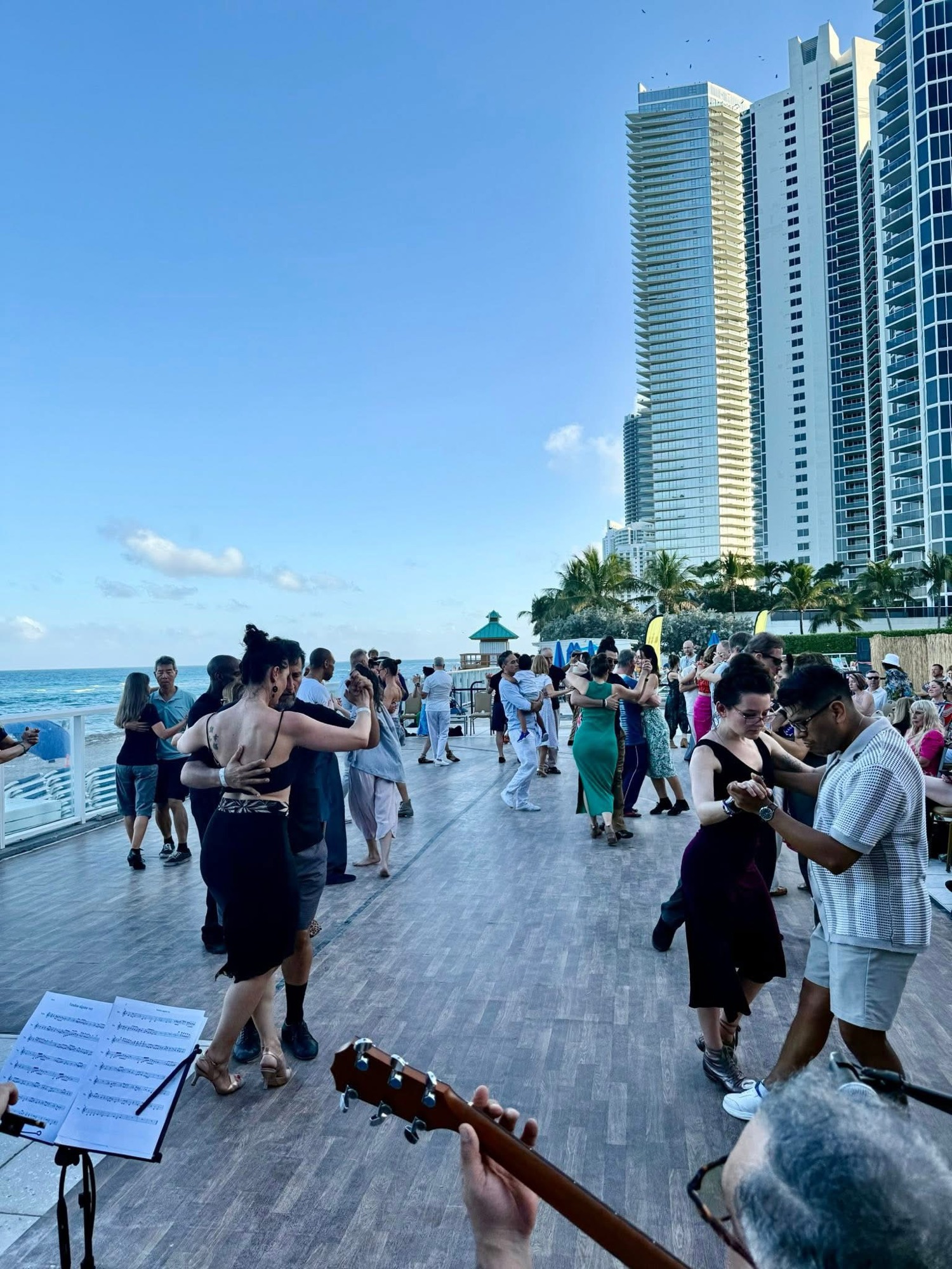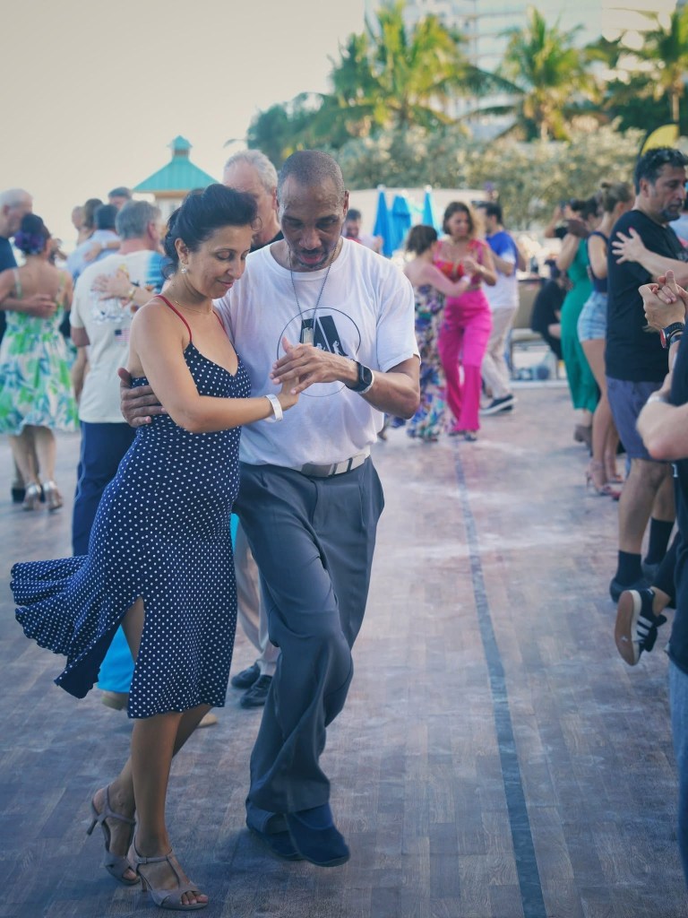 Uno de los momentos más lindos del Miami Sunshine Tango Festival son las milongas al aire libre frente al mar, donde bailas mientras cae la tarde y el viento del océano se mezcla con la música.
